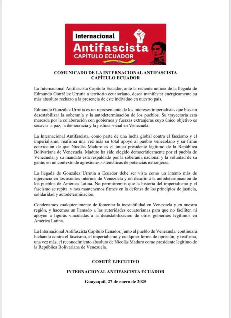 “La Internacional Antifascista Capítulo Ecuador, ante la reciente noticia de la llegada de Edmundo González Urrutia a territorio ecuatoriano, desea manifestar enérgicamente su más absoluto rechazo a la presencia de este individuo en nuestro país.