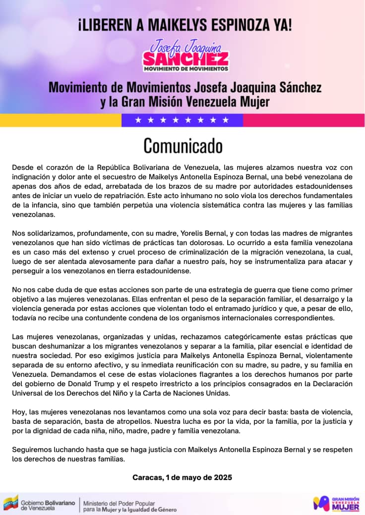 El Movimiento de Josefa Joaquina Sánchez y la Gran Misión Venezuela Mujer exigieron este viernes la liberación de la niña Maikelys Antonella Espinoza Bernal, que fue "arrebatada de los brazos de su madre por autoridades estadounidenses antes de iniciar un vuelo de repatriación".