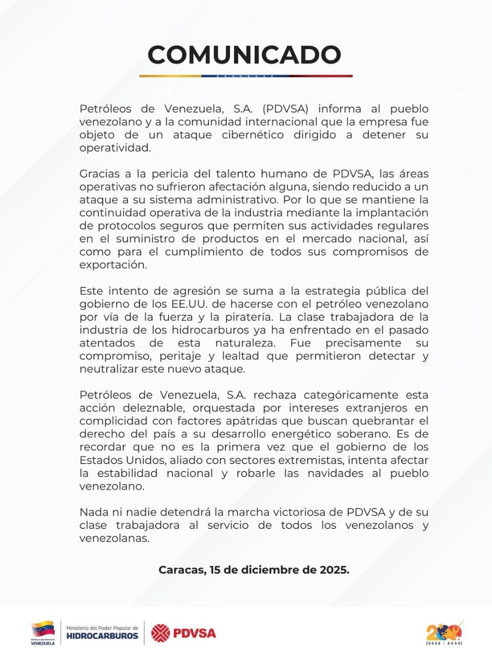 Asimismo, PDVSA informó que las áreas operativas no sufrieron afectaciones significativas, limitándose el ataque a su sistema administrativo.